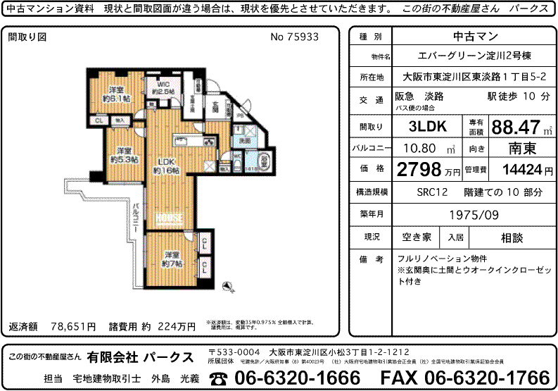 阪急淡路駅歩10分の東淡路1丁目にあるエバーグリーン淀川2号棟で、88.47平方メートルの3LDKがフルリノベーションで2798万円に金額変更されました。