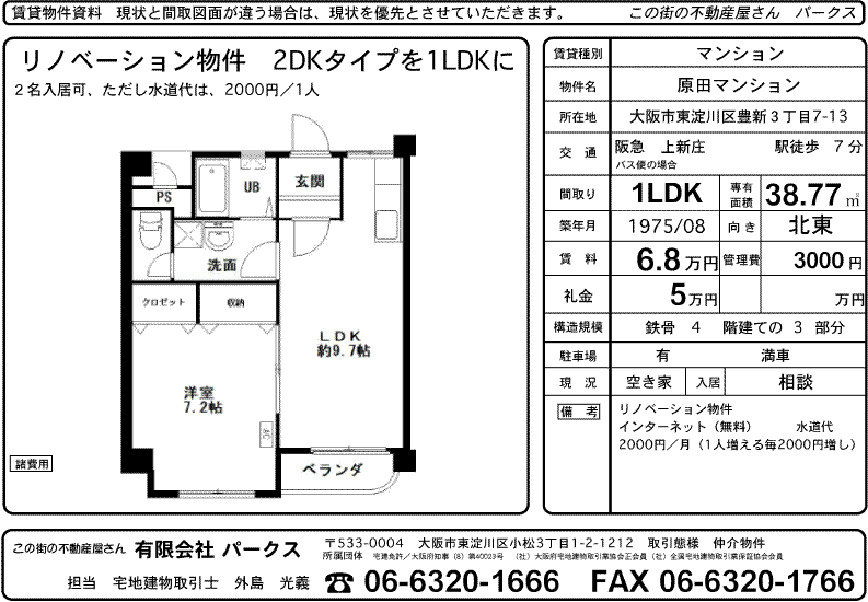 上新庄駅歩7分 豊新3丁目 原田マンションでリノベーション物件 2DKタイプを1LDKに