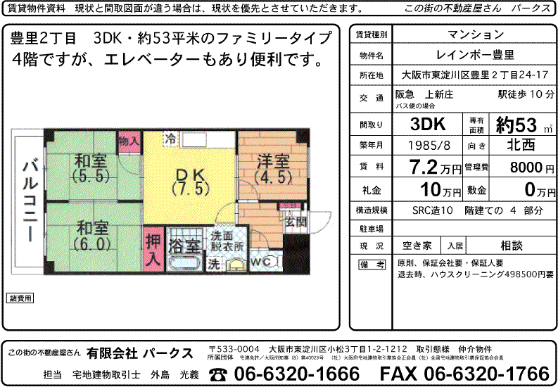 上新庄駅歩10分 豊里2丁目 レインボー豊里 3DK 72000円