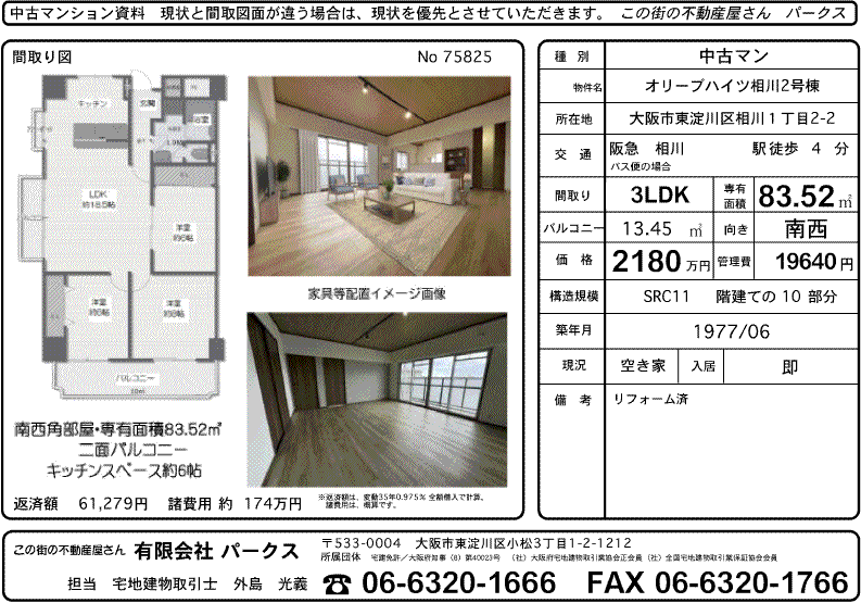 阪急相川駅歩4分の相川1丁目にあるオリーブハイツ相川2号棟でSRC造11階建ての10階 南西角部屋 83.52平方メートルの3LDKが改装済みで、2180万円で登録されました。カウンターキッチンタイプで広々LDKで気持ちがいいですよ。
