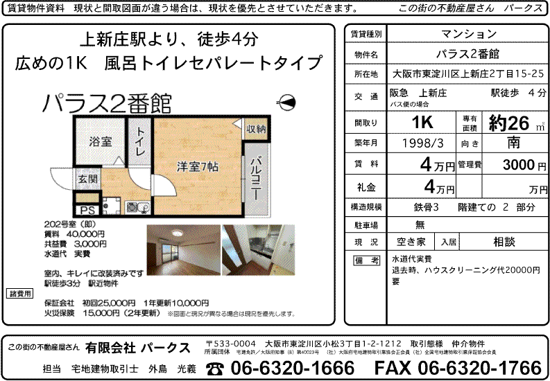 上新庄駅歩4分の上新庄2丁目にあるパラス2番館で 1Kタイプ 約26平方メートルが、賃料40000円で登録されました。 広めの1K 風呂トイレセパレートタイプ 室内きれいに改装済みです。 水道代実費 退去時、ハウスクリーニング代20000円要