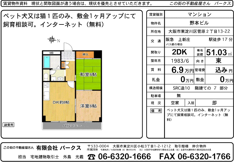 上新庄駅から徒歩17分の菅原2丁目にある野本ビルで、51.03平方メートルの2DKが69000円で入居者募集中です。 家賃は、69000円ですが、敷礼なし。管理費込みの69000円ですので、初期費用も抑えられます。 ペット犬又は猫1匹のみ、敷金1ヶ月アップにて飼育相談可。インターネット(無料)