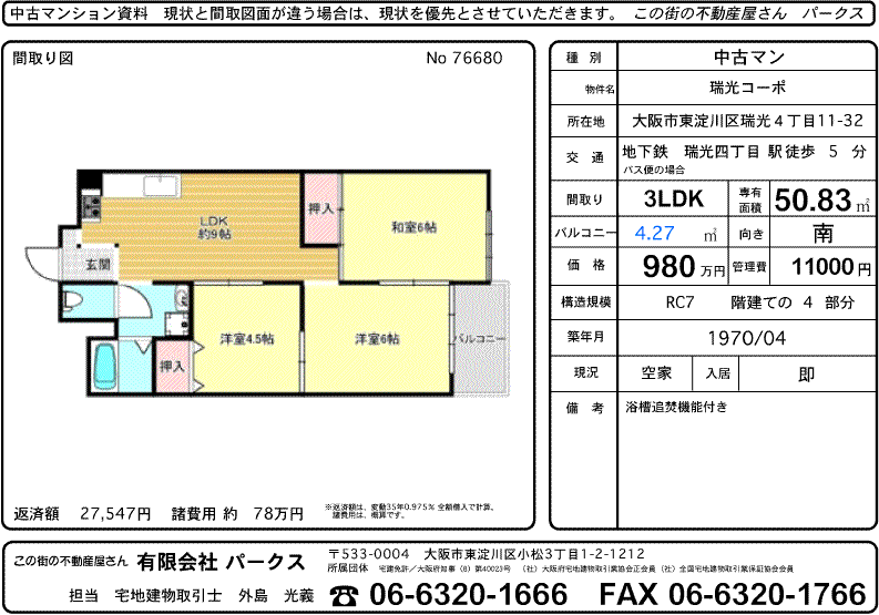 地下鉄瑞光四丁目駅歩5分の瑞光四丁目にある瑞光コーポで3DKが980万円で登録されました。 南向き・3DKタイプ 市バスの停留所も物件の前にありますので、バスで梅田に出ることも簡単です。 4階でもエレベーターで楽に行き来できます 浴槽追焚機能付きに変更されています。