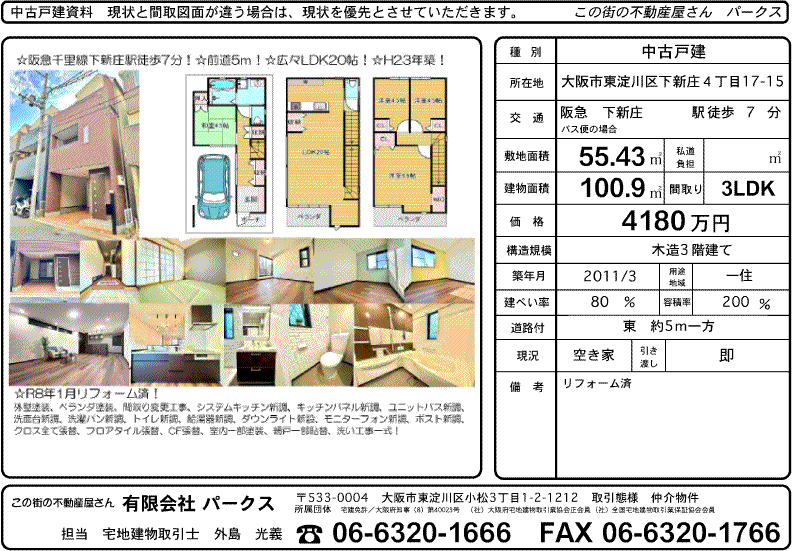 下新庄駅から徒歩7分の下新庄4丁目で、敷地 55.43平方メートル 建物延床面積 100.9平方メートルの3LDK+車庫の中古住宅がリフォーム済みで、4180万円で登録されました。 室内、非常にきれいになっております。一度、ご覧になりませんか?
