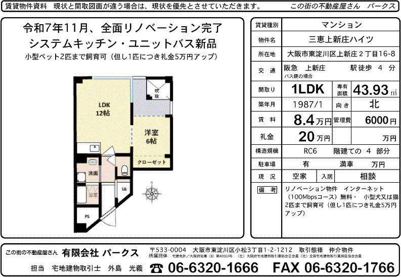 上新庄駅歩4分の上新庄2丁目にある三恵上新庄ハイツでリノベーション物件 1LDK 84000円が登録されました。 令和7年11月、全面リノベーション完了 システムキッチン・ユニットバス新品 インターネット(100Mbpsコース)無料・ 小型犬又は猫2匹まで飼育可(但し1匹につき礼金5万円アップ)
