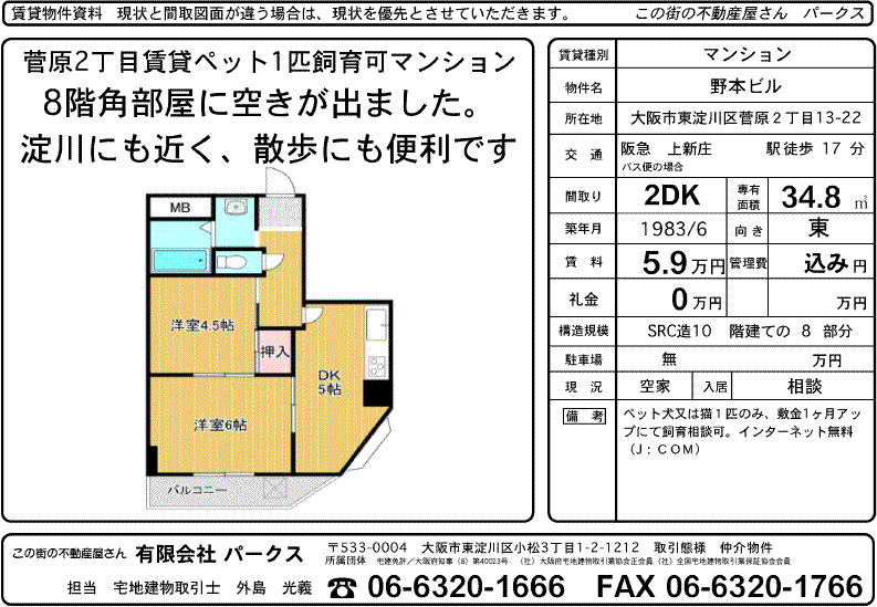 菅原2丁目賃貸ペット1匹飼育可マンション。野本ビルに、8階角部屋2DKタイプが59000円で空きが出ました。 淀川にも近く、散歩にも便利です。ペット犬又は猫1匹のみ、敷金1ヶ月アップにて飼育相談可。 インターネット無料(J:COM)