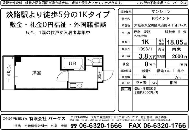 淡路駅歩5分 Pポイント 福祉・外国籍相談の1K 38000円