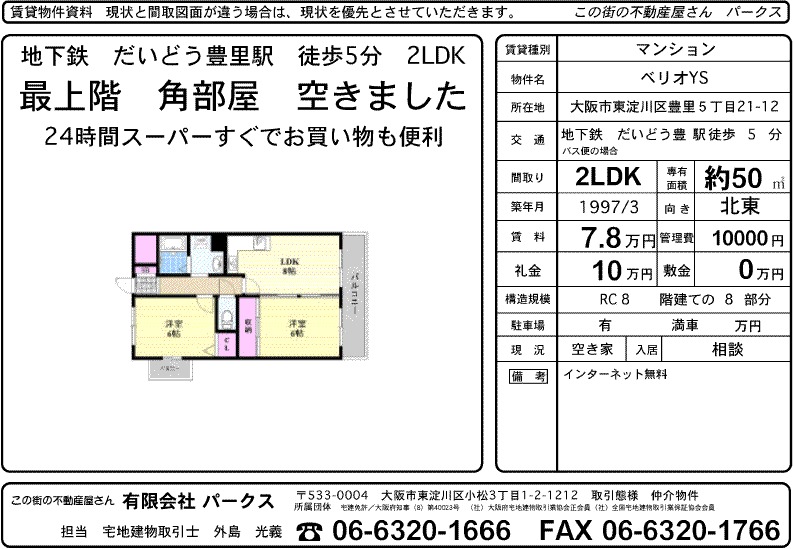 だいどう豊里駅歩5分 豊里5丁目 角部屋2LDK ベリオYS 78000円