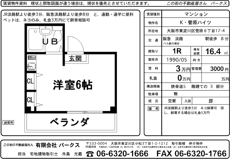 JR淡路駅より徒歩3分、阪急淡路駅より徒歩8分の菅原6丁目のK・菅原ハイツで1R 16.4平方メートルが、敷礼なし 30000円で募集中です。ペットは、ネコのみ、礼金3万円にて飼育相談可となっています。