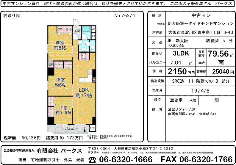 JR 新大阪駅歩5分の新大阪第一ダイヤモンドマンションで全室リフォーム済の南西角根部屋 3LDKが2150万円で登録されました。南西角部屋のため、全室明るく、発展する新大阪にも歩5分と近く、便利な立地です。