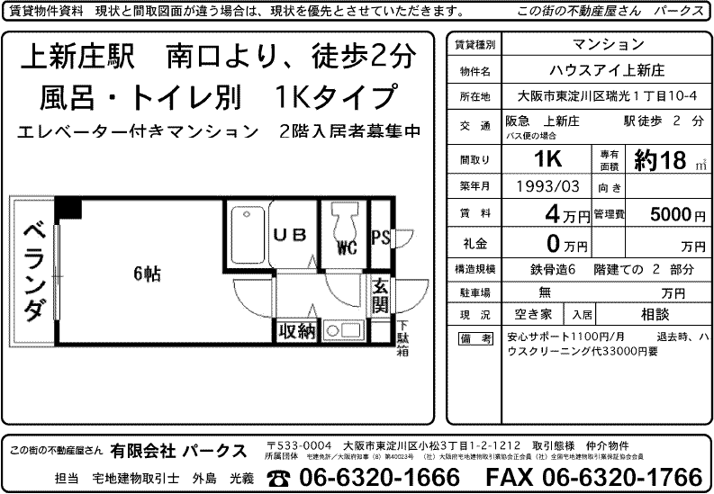 上新庄駅歩2分 瑞光1丁目 ハウスアイ上新庄 1K 40000円