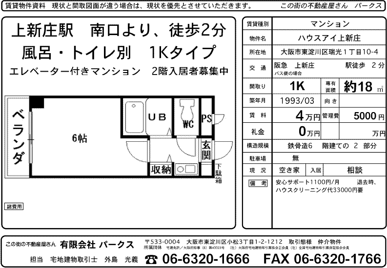 上新庄駅歩2分 瑞光1丁目 ハウスアイ上新庄 1K 40000円