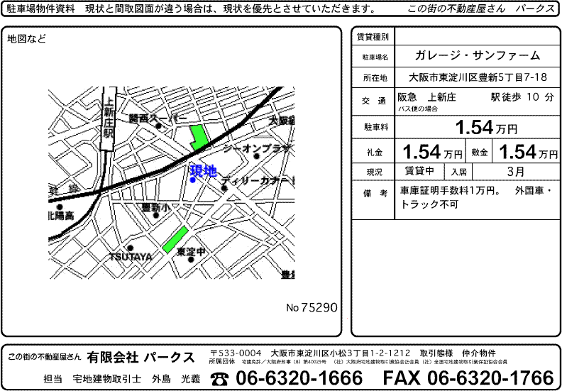 上新庄駅歩10分の豊新5丁目にあるガレージ・サンファームで普通車枠が2月末解約で、1台空き予定となりました。 賃貸条件は 敷金15400円 礼金15400円 月額駐車料金 15400円 車庫証明手数料1万円。 外国車・トラック不可となっています。