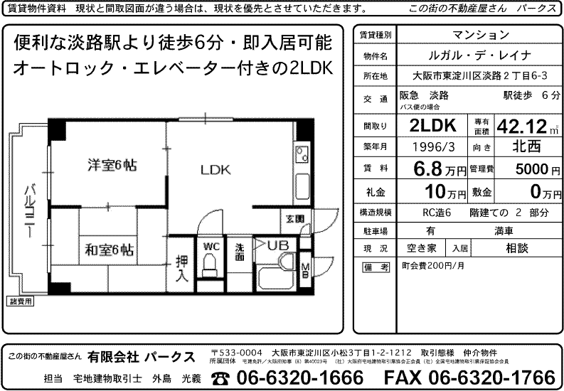 淡路駅歩6分の淡路2丁目にあるルガル・デ・レイナで2LDK 42.12平方メートルが 68000円で募集中です。 オートロック・エレベーター付きの角部屋の2LDK 淡路駅は、急行停車駅ですので、梅田や堺筋本町などにも1本で行けるので便利です。