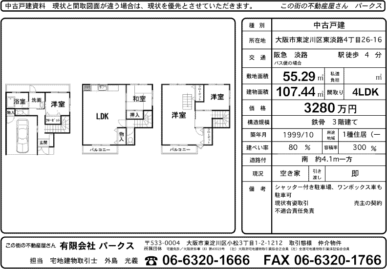 急行停車駅の淡路駅歩4分の東淡路4丁目で4LDK+車庫物件が3280万円で登録されました。 南向き4m道路に面し、鉄骨造の3階建て シャッター付き駐車場、ワンボックス車も駐車可 現状有姿取引、売主の契約不適合責任免責