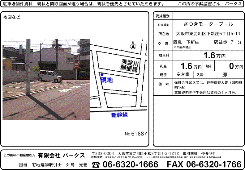 下新庄駅歩7分の下新庄6丁目でさつきモータープールの普通車枠が16000円で募集中です。 東淀川郵便局裏の広く車の通りの少ない道路に面した駐車しやすい駐車場です。 保証会社加入又は、連帯保証人要(印鑑証明1通)車庫証明発行手数料は賃料の1ヵ月分。