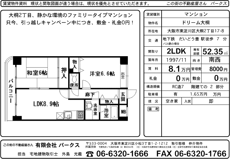 だいどう豊里駅歩7分 大桐2丁目のドリーム大桐で2LDK 52.35平方メートルが、81000円で募集中です。 大桐2丁目の静かな環境のファミリータイプマンション。 只今、引っ越しキャンペーン中につき、敷金・礼金0円となっております。